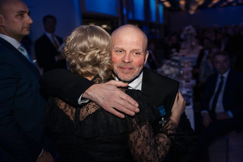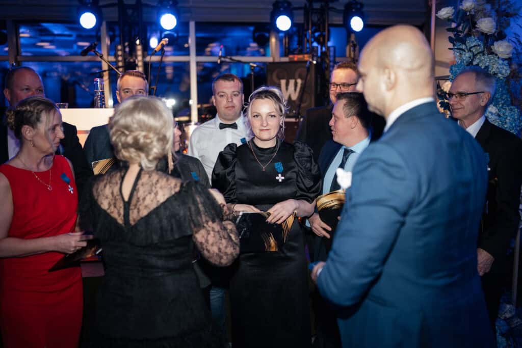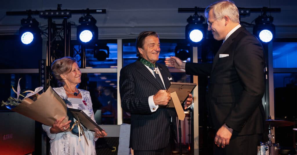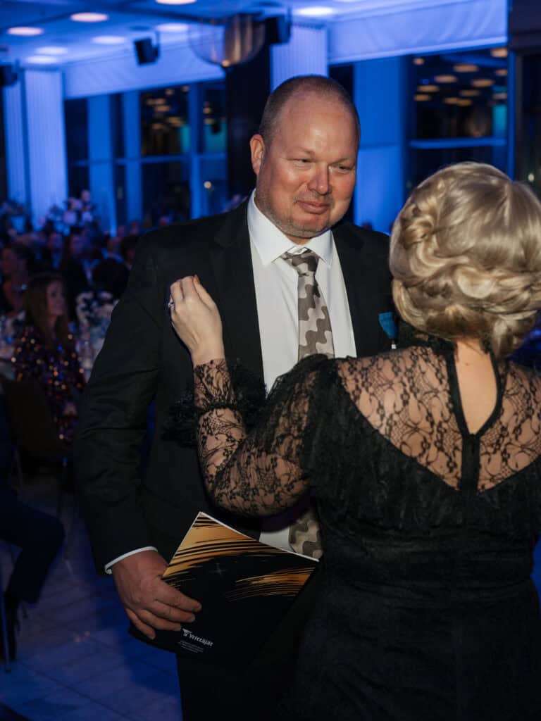 Juhlavan ja lämminhenkisen juhlan herkin hetki oli, kun Kalaneuvoksen perustaja Veijo Hukkanen palkittiin yrittäjien suurristillä. Ulla-Maija Hukkanen palkittiin yrittäjien timanttisella ansioristillä. Yrittäjäpariskunnan 50-vuotinen työ tuli hienolla tavalla näin näkyväksi.