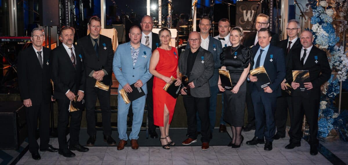 Pitkäaikaisia työntekijöitä muistettiin juhlien yhteydessä ansioristeillä. Ansioristi on arvostettu kunnianosoitus.