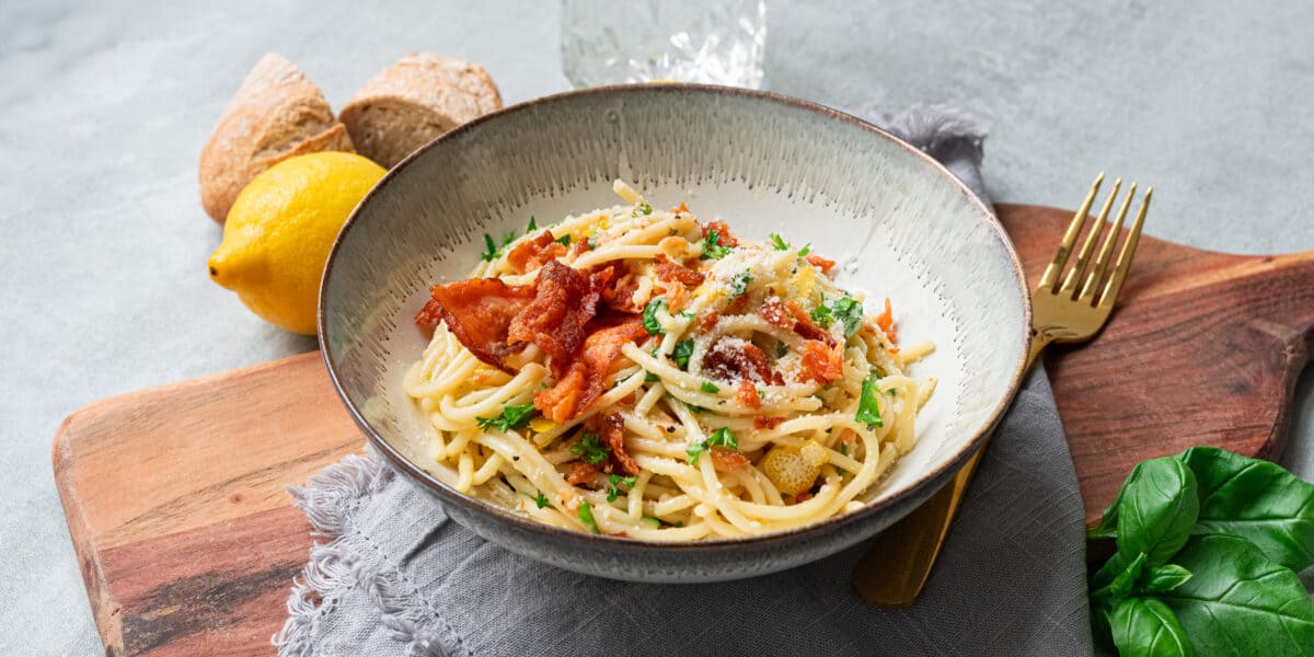 Pasta carbonara kirjolohipekonilla on helppoa ja nopeaa ruokaa, joka sopii arkeen ja viikonloppuihin. Pasta carbonara on italialainen klassikkoannos, jossa spagetti yhdistyy silkkiseen juustosta ja munasta tehtyyn kastikkeeseen. Annokseen lisätyt tuoreet yrtit ja sitruunankuori tuo raikkautta ja täydentävät kirjolohipekonin tuoman makumaailman.